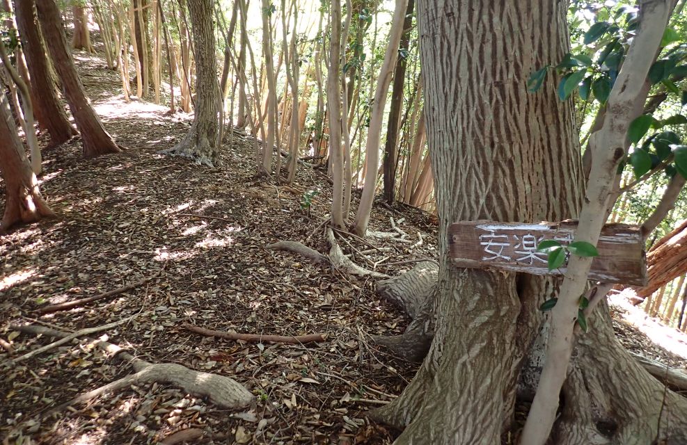 この道は地形図の徒歩道に繋がって間野の集落に出るのだろうと考えて進むと、すぐに廃屋があって、なんと「安楽寺/直竹」の指導標が現れた。「大仁田山/小沢峠」も付いているが、先ほど349mから下りかけた尾根へ上がるのか? 「間野バス停」とあるのを見ると、これまでの「黒指バス停」指導標も「間野」の誤りではなかろうか(黒指バス停は大仁田山の北北西、県道70号上で方角が違う上にずいぶん遠い)。それはともかく、こうなると安楽寺まで行かない訳にはいかない。現在12時半で時間的余裕はあるが、県境へのこだわりは捨てて、ここからは指導標に従うことにする。谷地形を登って尾根に入ると、また「大仁田山/小沢峠」の指導標があった(12:43)。帰宅後にGPSトラックを確認すると333m地点東の徒歩道で、やはりハイキングコースは堂所から採石場を掠めてここに繋がっていた。その先で道を塞ぐ倒木を迂回すると、実は倒木ではなく、新しく切り開いた作業道(おそらく採石場に至る)の木が伐採されていたのだった。また登山道に入って進むと、都県境尾根に復帰した。帰宅後に見つけたYAMAP記事(⇒ 【祝全通】成木尾根ハイキングコース2024)と自分のルートを比較すると、下の地図のような具合。安楽寺へのコースを素直に辿っていれば楽だったろうが、苦労した分、県境をほぼトレースできたと言ってよかろう。もっとも堂所から333m地点東までYAMAP記事で1時間15分なのに対して自分は1時間半だから、ハイキングコースにも難しさはあるのかもしれない。あとは尾根末端に向けてただ歩くのみ。ゴルフ客を横目にし、大多摩霊園脇の合戦坂を下り、安楽寺の敷地に出た。静かな本殿に手を合わせて13:55。久林バス停から5時間40分の行程だった。